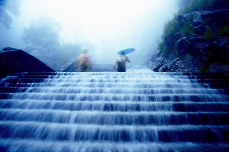 我们没有看到日出的奇景。那要在秋高气爽的时候。不过我们也有自己的独得之乐:我们在雨中看到的瀑布,两天以后下山,已经不那样壮丽了。小瀑布不见,大瀑布变小了。